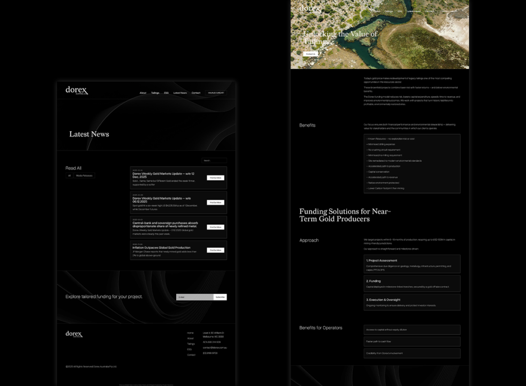 Dorex provides bespoke, non-dilutive financing solutions for near-term gold projects, with a strong focus on capital efficiency, resource reclamation, and environmental stewardship. I developed a custom brand identity and tone of voice, translating complex financial services into a clear and confident visual language. The project included the design and build of their website, featuring smartly categorised blog posts for media releases, as well as supporting print materials such as business cards to ensure consistency across all touchpoints.